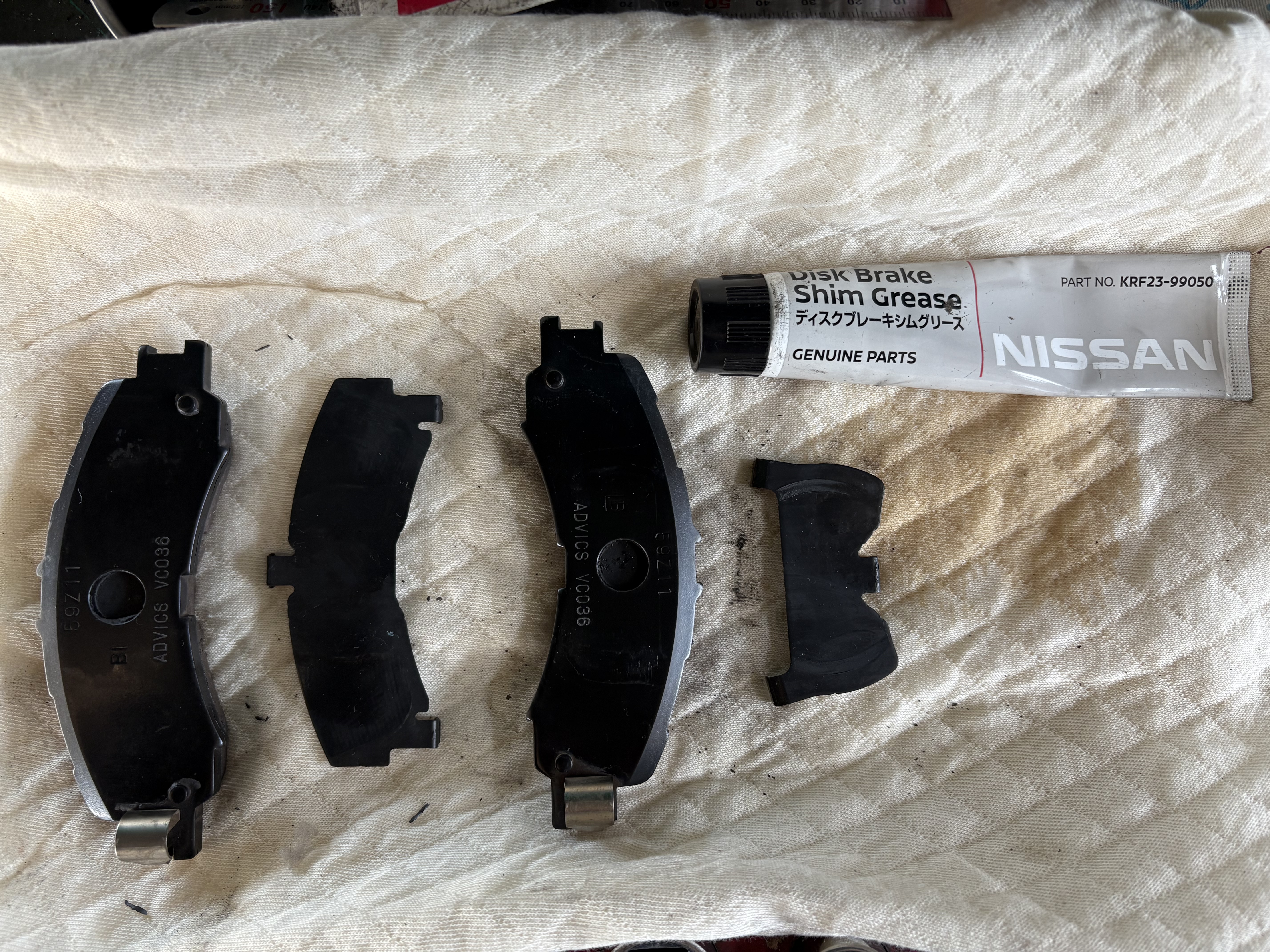 そして、ブレーキパッドとシム(ブレーキ鳴き抑制、熱の遮断・伝達の抑制等の役割)の間にグリスアップをします、グリスアップすることでブレーキ鳴き抑制、焼き付き等の防止になります!